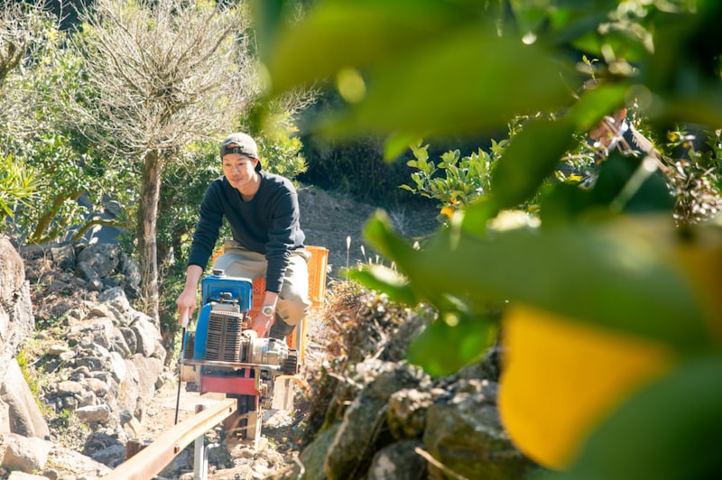 磯部農園さんの特徴である段々畑。平地に比べて水はけがよく、日当たりも満遍なく行き届くため、果実の生育には理想的なのだとか。その一方で、作業は重労働…。そんなときに活躍するのが、なんと50年以上前に設置された歴史あるモノレール!収穫の際には、このモノレールで上から下までサワーポメロを運搬します!!