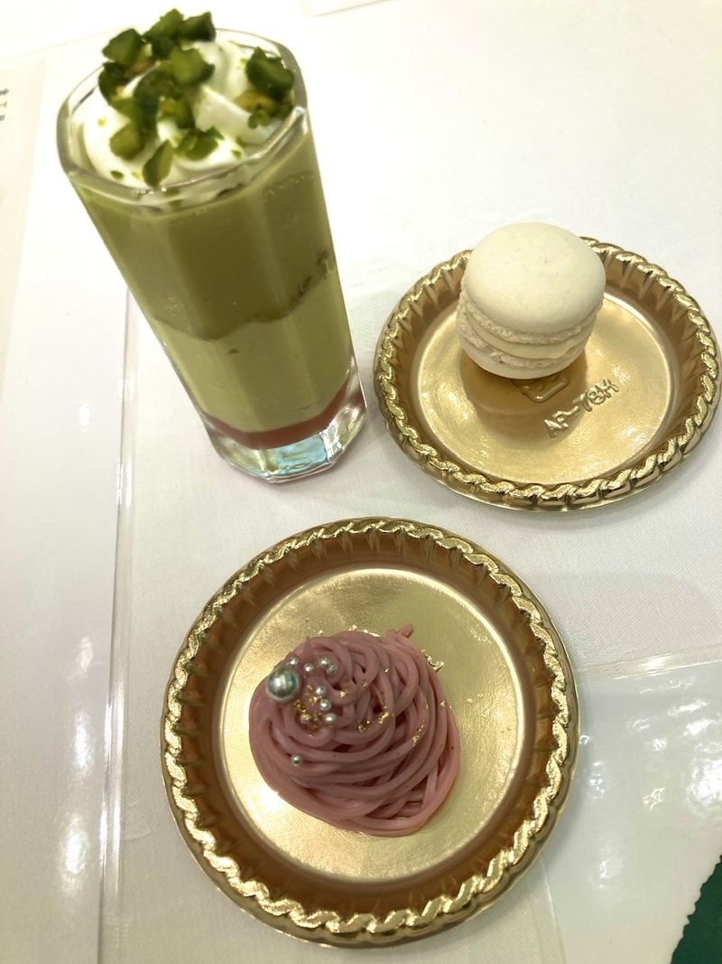 その中で試食した3品、ピスターシュベリー(画像左上)、マカロン(画像右上)、フランボワーズのモンブラン(画像下)。ピスターシュベリーは二層の異なる味わいのピスタチオムースですが、上層は濃厚で下層は軽めの味わい、そしてそれぞれの異なる食感を楽しめる1つで楽しめました。マカロンはホワイトチョコレートのアクセントを味わえました。モンブランはフランボワーズの酸味が心地良かったです。