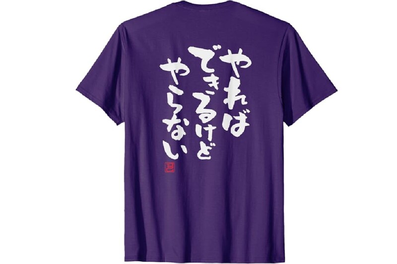 背中に大きく「やればできるけどやらない」と書かれた、ユーモア満点のプリントTシャツです。