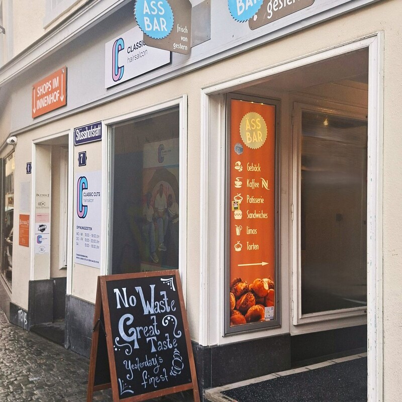 チューリヒの旧市街にあるエス・バー ニーダードルフ店は、パン職人やパティシェがいないパン販売店だ。バゲットなどの大型パンから、惣菜パン・菓子パン、ケーキまで、店内で販売する品々はすべて、市内の提携パン屋や洋菓子屋から無料で仕入れている(スイスではパン屋兼洋菓子屋も多い)。前日の売れ残りのため、大幅に割引した価格になっている。現在、提携店は20を超え、提携店には売り上げの一部が支払われる。