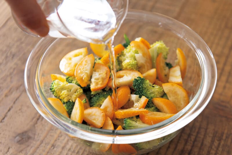 1. ブロッコリーを一口大に切り、金柑は5ミリ幅の薄切りにして種を取り、耐熱ボウルに入れる。ボウルの下から1cmまで水(分量外)を入れ、ふわっとラップをかけて600Wの電子レンジで5 分30 秒加熱する。そのまま30 秒ほど置き、ラップを外して冷ます。