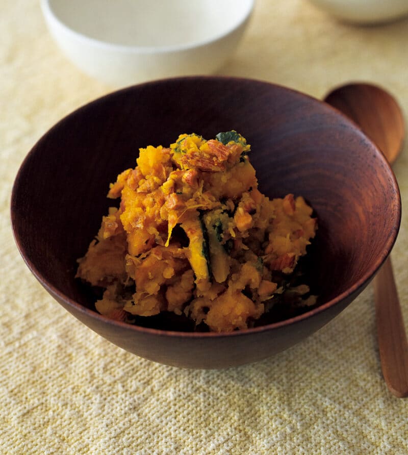 お好みですが、かぼちゃはさっくり粗めにつぶすと、アーモンドの歯応えともマッチします。