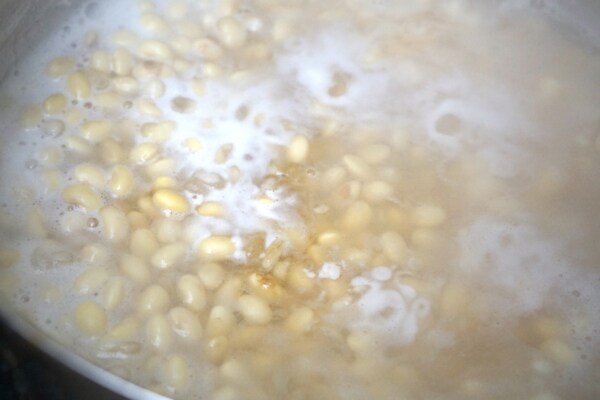 まずは大豆を茹でるのですが、大切なのは浸水。大豆を洗って、丸一日しっかり浸水させて、ムラなく茹で上がるようにしておきます。そして柔らかくなるまで茹でるのですが、柔らかくなるまでって一体どれくらい?というのがずっと疑問でした。