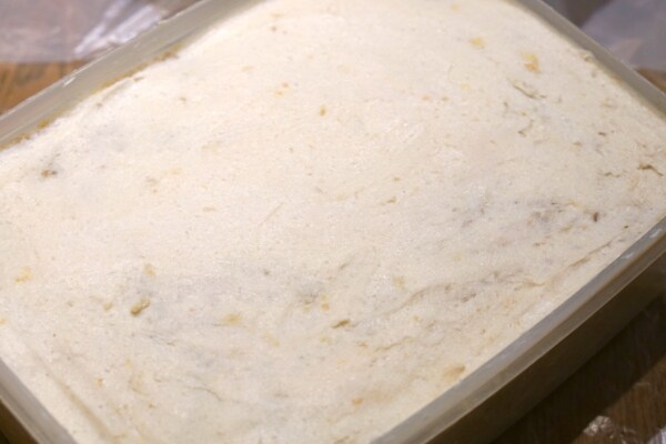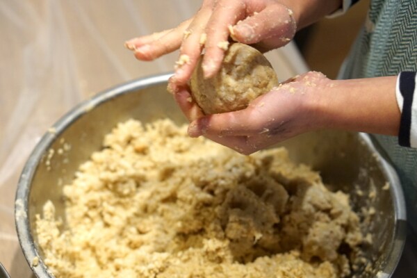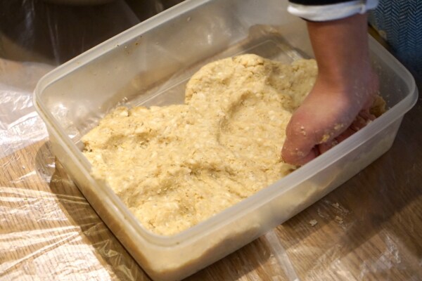 さて、では作業に戻ります。 先ほどしっかり混ぜてペースト状になった大豆と塩きり麹を、空気を抜きながら丸めて味噌玉を作って、それを保管容器に空気が入らないように隙間なく詰めます。