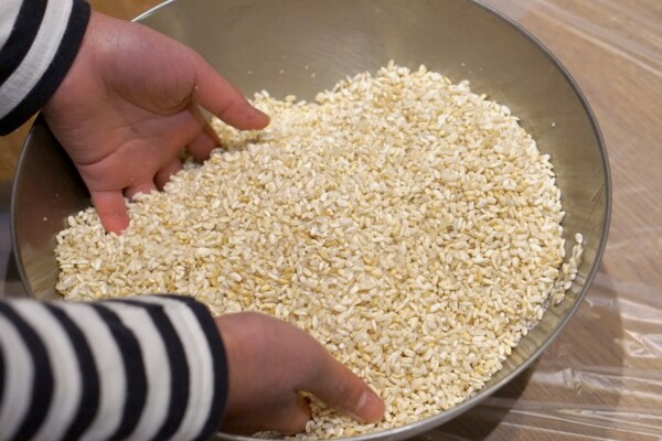 次に、大豆を茹でている間に麹と塩を混ぜて「塩きり麹」を作ります。我が家は合わせ味噌なので、白米麹、玄米麹、麦麹を混ぜています。