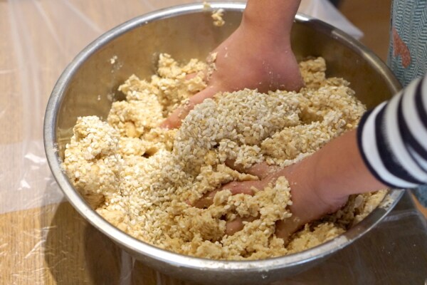 色々試した結果、ビニール袋に大豆を入れて上から押したり踏んだりするのが一番効率が良かったので、かなり大胆な感じがしますがこうやって作業しています。 大らかな作り方なので、潰しきれずに豆のまま残っているものもあるけれど、お味噌汁を作った時に潰れていない大豆が入っていると「当たり」のような気がして嬉しいのです。満足いくまで大豆を潰したら、先ほどの「塩きり麹」と混ぜます。よく混ぜます。麹と塩と大豆をペースト状になるまでムラなくしっかり混ぜます。ここ大事。 一番時間がかかるのがこの作業。大豆が固かったり水分量が足りないと混ぜにくいので、この時にパサパサしているようだったら、大豆の茹で汁を入れて滑らかになるよう調整します。