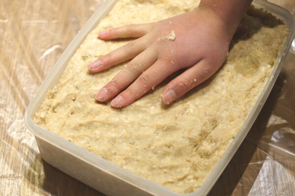娘が幼稚園に入ってからは、彼女も自分用の小さいタッパーで一緒に味噌を作っています。 彼女にとっては今回で七回目の味噌作り。 今では、何も言わなくても一緒に材料を用意すれば一人で全部作れるくらいになりました。 彼女が大人になったら、毎年自分で味噌を作るのかな、などと考えると楽しくなります。