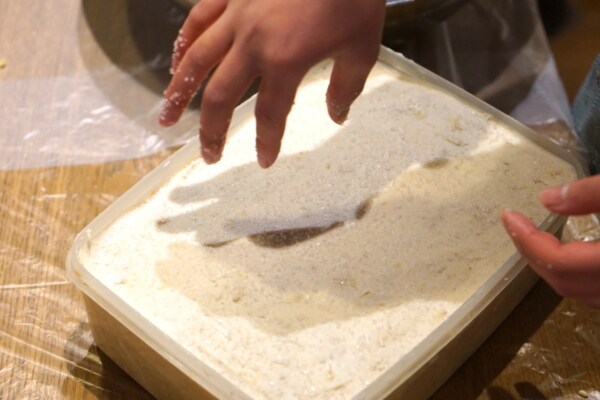 酒粕で 蓋純米酒の酒粕を薄く伸ばして蓋をします。