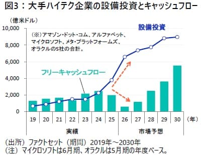 もっとも、足元での市場の注目は好調な企業業績そのものよりも、ハイテク・セクターにおける設備投資の回収の行方に集まっています。今回のハイテク企業決算でも、AI関連の設備投資を大幅に積み増す傾向が続いており、拡大する投資がキャッシュフローを圧迫するとの懸念が市場の不透明感につながっていると考えられます(図3)。