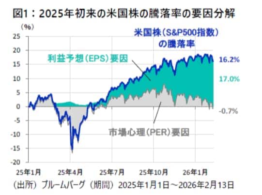 2026年初の米国株は、AIブームへの期待と警戒が交錯し、一進一退の値動きが続いています。足元では市場心理が悪化に向かう中、利益成長への期待が株価を下支えする構図にあります(図1)。