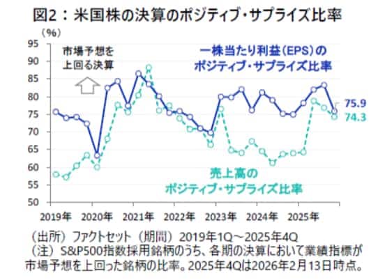 2026年1月下旬から本格化している米国企業の決算では、概ね堅調な業績が確認されています。2月13日時点でS&P500指数構成銘柄のうち374社が決算を公表しており、そのうち75%強の企業は一株当たり利益が市場予想を上回りました(図2)。