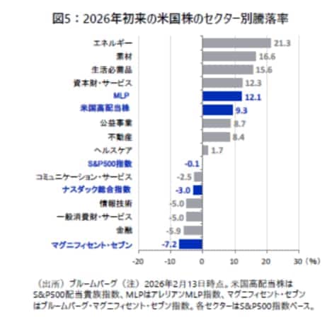 こうした中、2026年初来の米国株のセクター別騰落率を見ると、2025年に好調なパフォーマンスを示したハイテク株が軟調な傾向にあります(図5)。