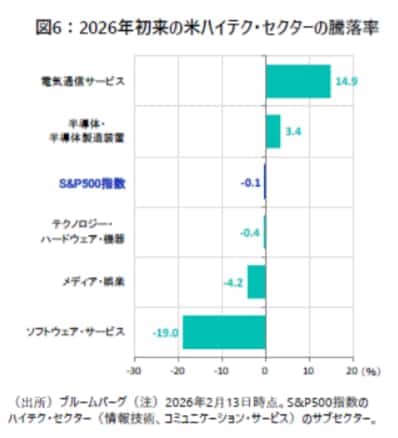 特に足元では、AIが既存の多様なサービスを代替する「AI脅威論」が新たな懸念材料として意識され、ソフトウェア・サービス株の下落も顕著です(図6)。ハイテク・セクターでは、AIの急速な進化と普及を背景にビジネスモデルの持続性が問われつつあり、2026年は銘柄間での選別が一段と進む可能性がありそうです。