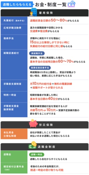 転職や定年で会社を退職すると、「退職後にもらえるお金」にはどんな種類があるのか気になる人も多いでしょう。退職金や失業保険はもちろん、再就職を支援する給付金や生活費を補助する制度もあります。