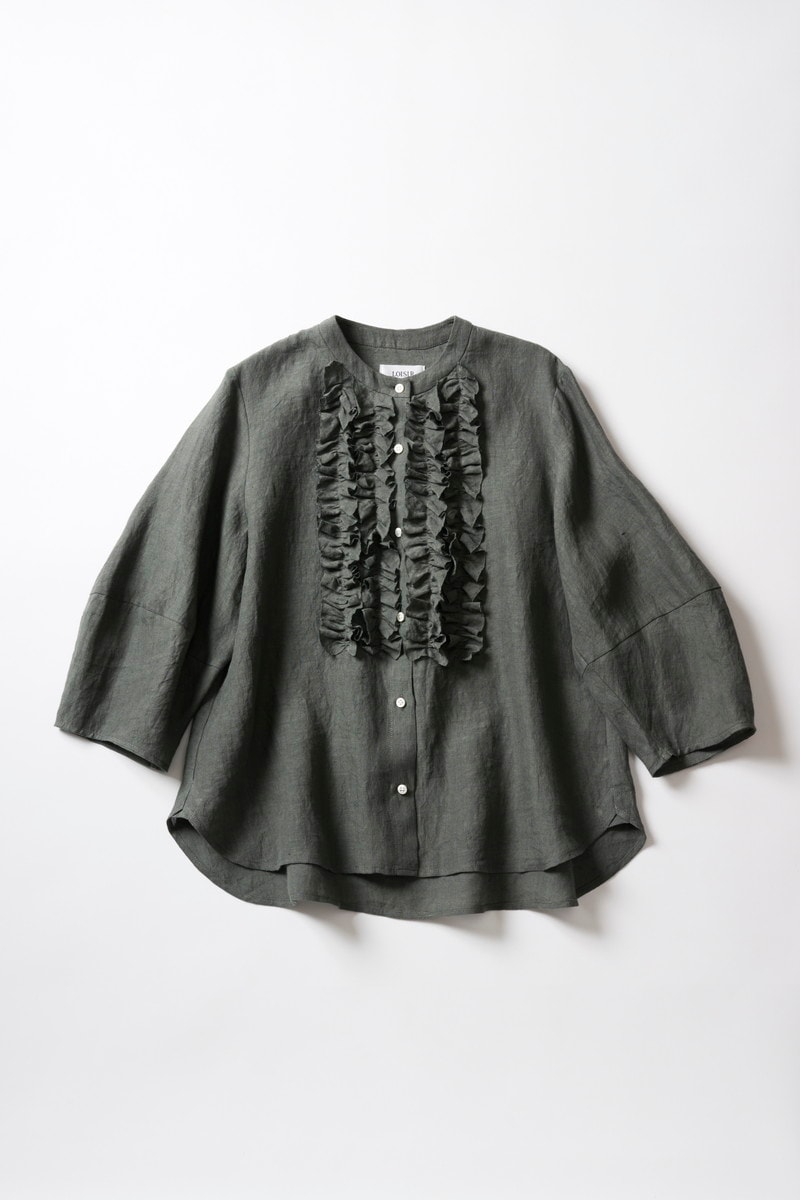 ハリのあるリネンなどの天然素材は、エレガントになりすぎずカジュアルシーンにぴったり。色も渋いモスグリーンだから、フリルでもクールに見えます。