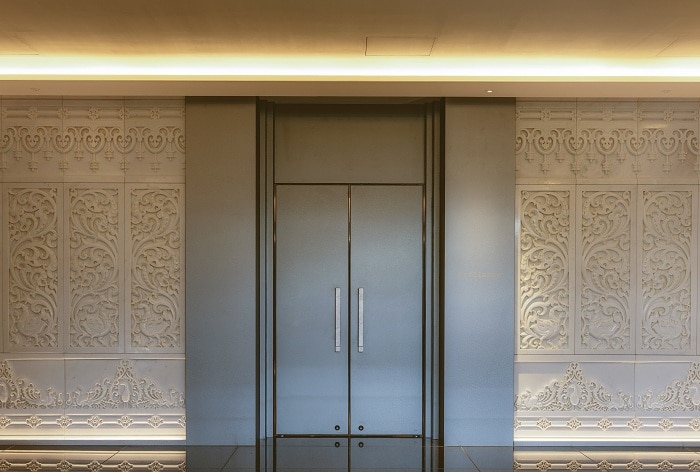宿泊ゲストしか開くことのできない扉の向こうはまばゆいばかりの黄金の世界。ロビー階の4階に到着し、エレベーターの扉が開くと、正面には黄金に輝く見事な松のオブジェが置かれ、その奥に池泉庭園と名古屋城が一幅の絵のように広がる。