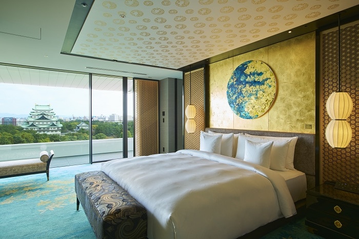 客室はわずか100室。名古屋城を望むバルコニー付きの部屋では、ベッドの上からでも浴室からでも天守閣を間近に感じられる。地下2階には天然温泉を備えたスパ施設があり、モロッコランプの影が揺れる幻想的な空間では、エキゾチックな美しさと和の静寂が溶け合う。