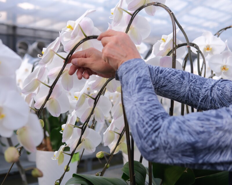 苗からの栽培に要する期間は、約6か月。徐々に伸びていく花茎の形を支柱とワイヤーで誘導し、美しい弓型を描くように育てていきます。花が咲いたら保護カバーをかけ、頃合いを見て花き市場への出荷作業へ。すべて手作業で行われています。