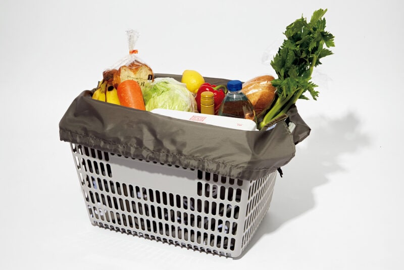 一般的な買い物かご(最大サイズ:縦34.5×横46.5×高さ25㎝まで)にセットできるので毎日のスーパーでのお買い物に重宝。レジのあとに詰め替える手間を省けます。