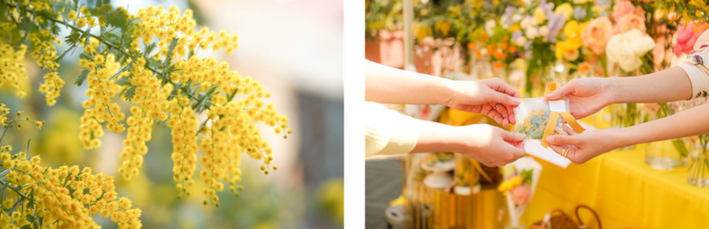 イタリアの青空市場を思わせるマルシェに、ジャグリングやフラフープパフォーマンス、ジャズやイタリア歌曲のライブなど、週末限定イベントを実施。マルシェでは、ミモザの切り花やリース、ドライフラワー、ミモザを使ったアクセサリーに、ミモザモチーフのクッキーなど、ミモザを存分に楽しめるショップが並びます。
