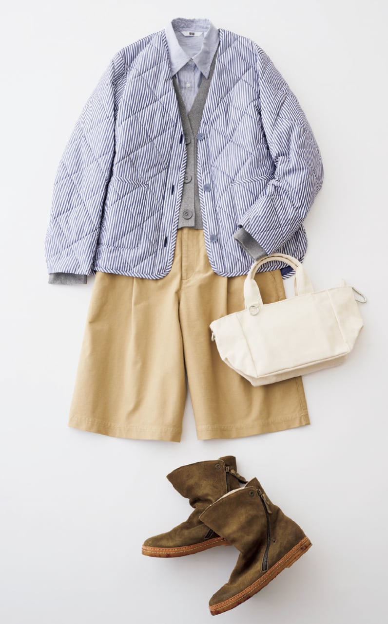 カーディガン¥3,990、ストライプシャツ¥3,990、ハーフパンツ¥2,990/すべてユニクロ、ほかはスタイリスト私物