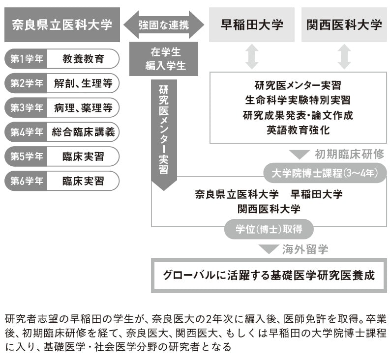 早稲田から編入後、5年間の教育課程を基本として、学生は奈良医大を卒業後、医師免許を取得する。その後、医師臨床研修を受け、臨床的素養を身に付けた上で、奈良医大または、関西医大、早稲田の大学院に進み、最終的には基礎医学や社会医学の分野で研究者として活躍するというキャリアプランだ(図表参照)。