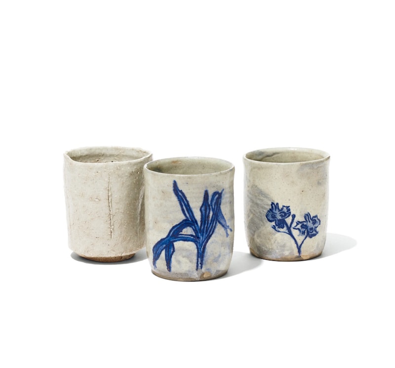 江戸初期頃に作られていた唐津の素材、砂岩をベースに常に新しい作品を発表し続けている作家。手のひらにすっぽりおさまるサイズで、染付は手描きの花が両面に添えられている。煎茶のふくよかさを誘う小さな湯呑みに、自然の力強さが宿っている。右から/染付湯呑各¥6,600、素瓷湯呑¥11,000(以上ラパンアート)