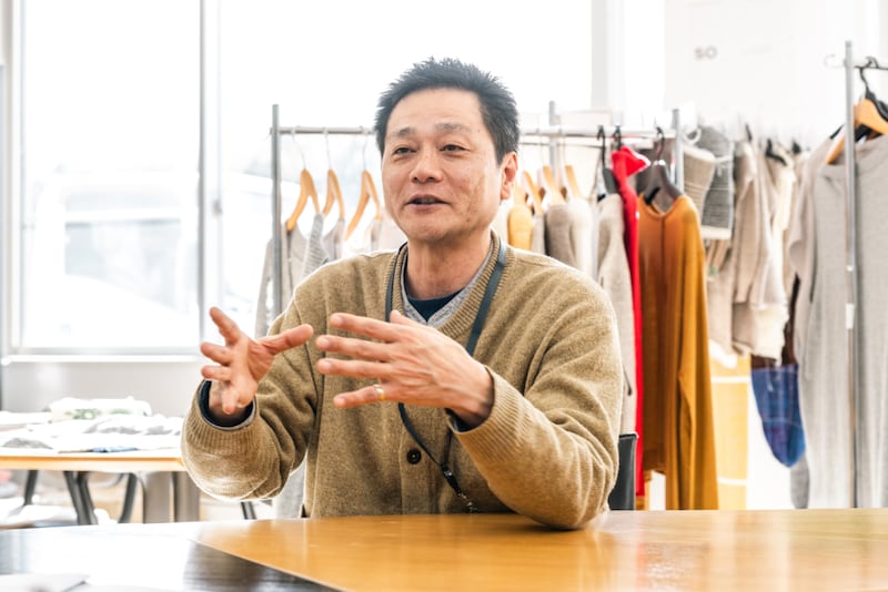 「私たちは、レディースアパレルのオリジナルブランド「SO(エス・オー)」を中心に、企画から販売まで手掛けています。これまで生産はすべて外部に委託しており、ニット製品に関してはほぼすべて海外製でした。国内のニット工場はどこも高齢化などで生産力が激減しているからです。ただ、糸からこだわって開発する私たちにとって、なかなか求めるクオリティが出せないこともあり、これをなんとか国内に回帰させたいとずっと考えていて。日本各地に委託先を探すなかで出会ったのが、葛尾村のこの場所で操業していた会社さんでした」