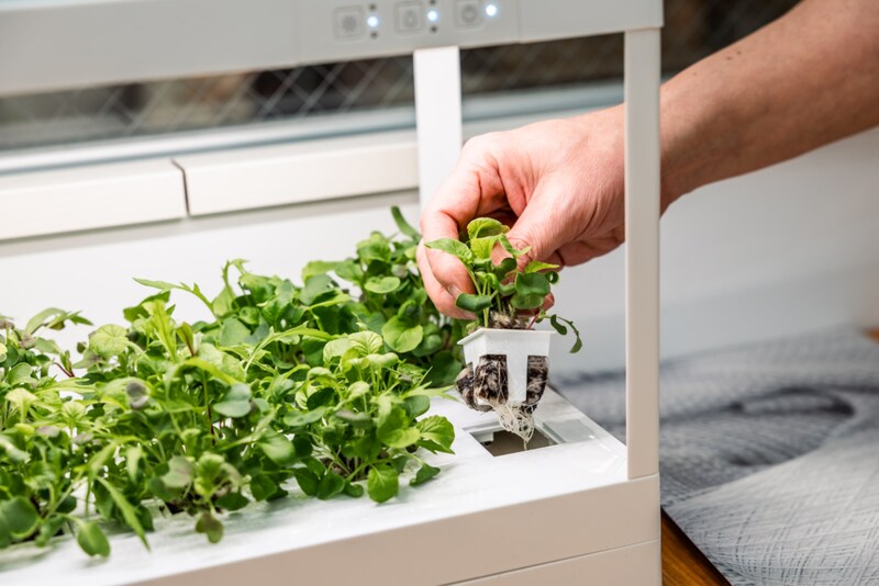 ウールの苗床で育つベビーリーフや水菜。将来的には、こうした食材を併設予定のカフェで提供することも視野にあるとか