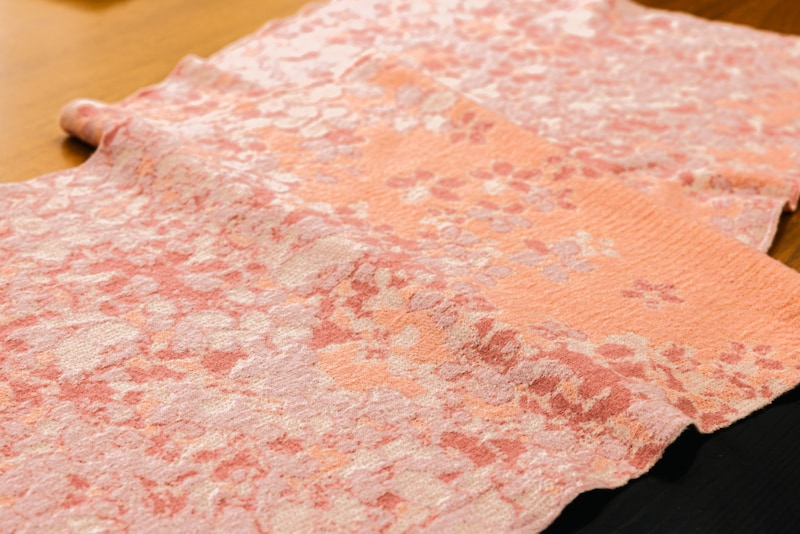 「彼の技術はすごいんですよ。このストールは、(同じ双葉郡の富岡町にある桜の名所)夜の森の桜のトンネルをイメージして、と伝えただけでこのようにプログラミングしてくれました。デザインだけでなく糸のことも熟知していないとできないことです」