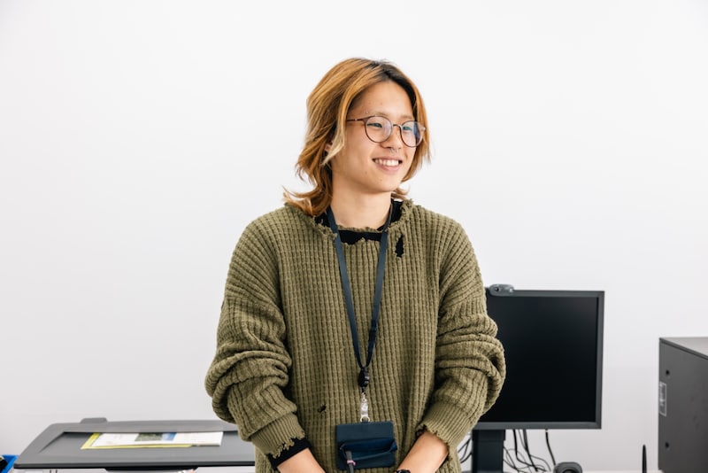 「福岡では仕様書(衣類の形状、色柄、糸の指定などの設計図)を書いていますが、実際の製造現場を見たことがなかったので、ここでの経験はとても役立っています。研修は毎月2週間ずつ、もう5回目になるかな。正直、葛尾村って聞いたことはありませんでした。田舎は不便じゃないかと聞かれますが、自分も祖母の家が福岡の田舎なので全然気になりません」