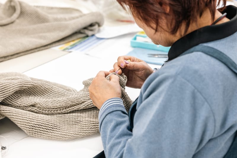自動横編機が並ぶエリアの隣には、縫製・仕上げの作業エリアが広がります。ここでは、糸の始末、洗浄、アイロンがけ、タグ付け、袋詰めなどが行なわれていました。