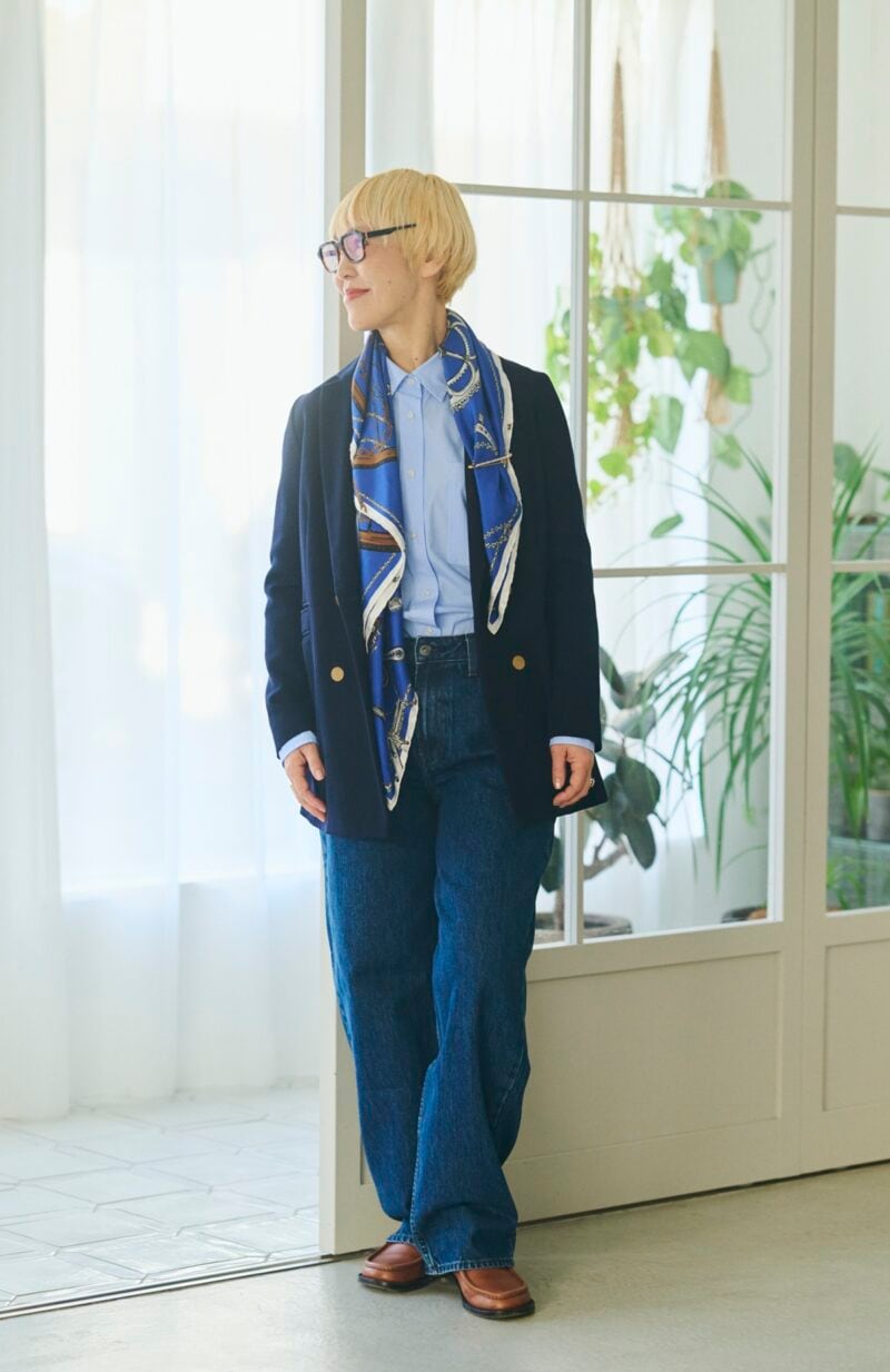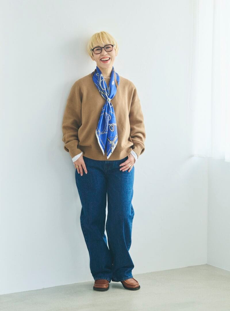 デニムにスウェットのラフなコーデも、お出かけ仕様に早変わりする、縦長なスカーフアレンジ。「リングでまとめる場所は、バランスをみて上でも下でもOK。ジャケットやセットアップに合わせても、もちろんおしゃれですよ。リングが落ちそう、と心配する方もいますが、布の摩擦もあるのでちゃんと留まります」