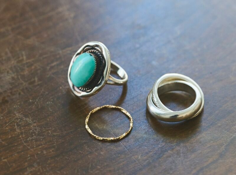 スカーフリングに使うのは、どんな指輪でもOK。さりげなく合わせるなら細い指輪、ポイントにしたいなら、太いものや石付きを選んで。