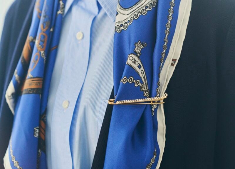 「ジャケットやスプリングコートに合わせるなら、キルトピンを使う方法もありますよ」。肩にかけたスカーフを、キルトピンに通して固定するだけなので、とっても簡単。留めていない側はジャケットの中に隠してもOK。スカーフを「巻いている」という感じがないので、巻くのになれない人でも着こなしやすいはず。
