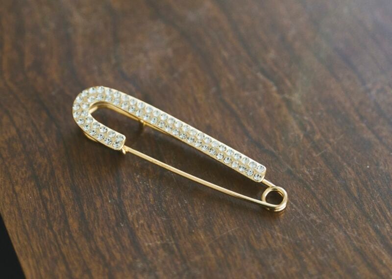今回はビジュー付きのピンを使っていますが、手芸店や100円ショップでも同じ形にピンが売っています。