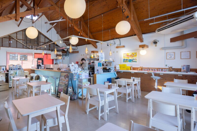 最後に、島の駅あいのしまの2階にあるカフェ「♡SIMA Cafe SWEETS HOME」に立ち寄りました。島ウマバーガー、国産レモンを使用したレモンケーキなど、グルメも充実していましたよ。可愛い猫モチーフのお土産もたくさんありました〜!