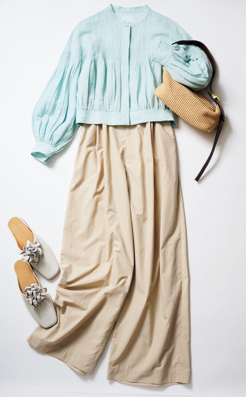 バブーシュ(コサージュは着脱可)¥22,000/オデット エ オディール(オデット エ オディール 新宿店)、ブラウス¥49,500 /フィータ、パンツ¥33,990 /アストラット(エ