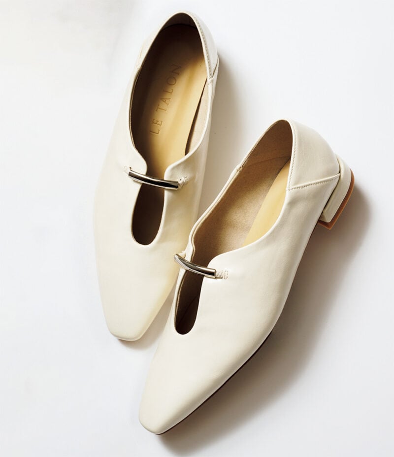 春らしいペールトーンの装いを白の足元で引き立てて。あえてかかとを覆わないミュールで軽やかに。