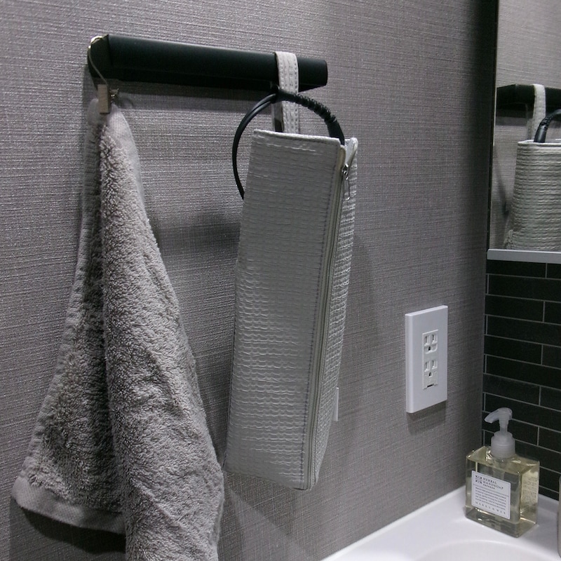 耐熱素材のヘアアイロンケース。洗面所に吊るしておけば、アイロンをスムーズに出し入れ&収納。洗面台でアイロンホルダーとしてや、旅行用のヘアアイロンポーチとしても使えます。