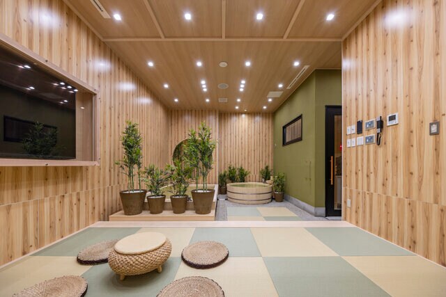 6階のアジアゾーンには、和をモチーフにした新エリアが登場。90人が収容できる茶の湯サウナでは「ほうじ茶ロウリュ」が体験でき、落ち着いたライトアップと香りに癒しをもらえます。2種類の水風呂(8度・16度)、露天の外気浴スペースも充実。