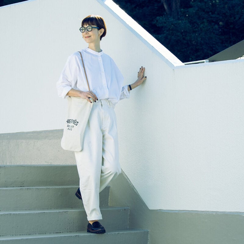 白を基調にしたお仕事コーデは、黒縁のめがねと、フリマサイトで見つけたエルメスのバッグ「アリーヌ」で抜け感を出して。