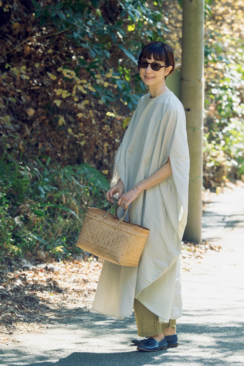 「色が足りないと感じたら足元に差し色を入れたり、黒やグレーのときはかごバッグで軽やかさを加えたり。全身白のコーデなら黒のバッグで引き締めることも。シーンにあわせて使い分け、全体の重さを調整します」