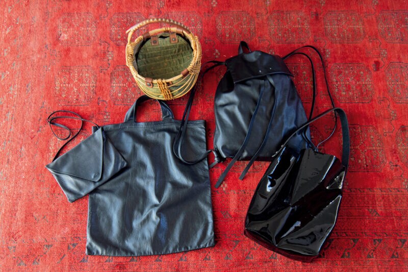 黒のバッグは左から「REN(レン)」のショルダー、コム デ ギャルソンのトート、セレクトショップで購入したリュック、TEMBEA(テンベア)のパテント素材バッグ。