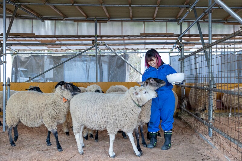 現在は、飼育スタッフとして羊のお世話をするほか、ふれあいイベントやSNSの発信も担当しています。私は主に、ふれあいイベントに参加する約15頭の羊を担当しています。一日の仕事は、ミーティングをすることから始まり、そのあとは、えさ箱の掃除をして羊たちに朝ごはんをあげます。その後は羊の毛玉を取ったり、爪を切ったり。人に慣れてもらう必要があるため、部屋の中に入って羊たちと同じ空間で過ごす時間を意識的に作っています。4月に入社した頃と比べると、どの羊もずいぶん慣れてくれて、成長を感じられるようになりました。