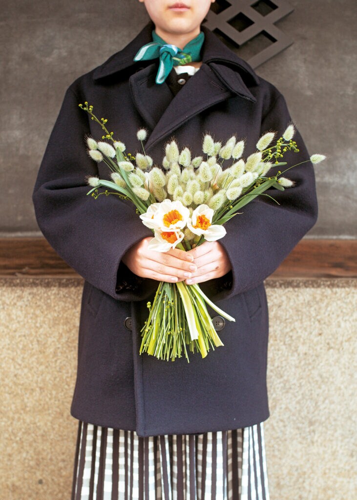 京都・四条河原町の生花店『スー・ボワ』の店主、鈴木大介さんが紹介してくれた今月の花は、白い花弁とオレンジのカップのコントラストが印象的な水仙の一種、ヨハンストラウス。「寒さに強く、一足早く春の気配を運んでくれる水仙。和花のイメージが強いですが、このようにポップな表情のものもあるんです。今回は、ウサギのしっぽのような穂をつけるラグラスバニーテールと合わせて、軽やかで愛らしいブーケに。枝もののアオモジは、あえて蕾が少ないものを選び、京都らしい可憐さも添えました。ドライにしても、また違った上品さを楽しめますよ」 (スー・ボワ 075−708−2564) コート¥110,000(A.P.C./アー・ペー・セー カスタマーサービス 0120−500−990) スカート¥61,600(アナトミカ/アナトミカ 東京 070−3144−0378)その他スタイリスト私物