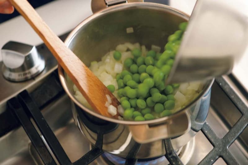 2.小鍋にバターを溶かし、新玉ネギを弱火で炒めて透き通ってきたらグリーンピースを加えて粗塩をふり、ざっと混ぜて白ワイン、水を加えてフタをし、弱火で10分、蒸し煮にする。