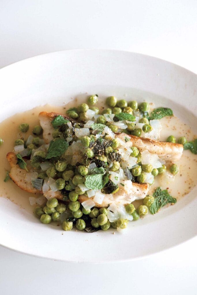 先生:まさに。最後は「鯛のムニエル グリーンピースミントバター」のソースから。新玉ネギは1㎝角に切って、グリーンピースはサヤから出します。小鍋にバターを溶かし、新玉ネギを弱火で炒めてグリーンピースを加えます。粗塩をふって混ぜ、白ワイン、水を加えたらフタをし、弱火で10分蒸し煮にします。鯛は塩をふって5分おき、ペーパーで水気を拭き取ります。塩、白胡椒をふって薄力粉を薄くはたき、フライパンにオリーブオイルを熱して鯛を中火で両面焼き、皮にナムプラーをかけてお皿にのせます。温めたソースにミントの葉を加え、鯛にかけて召し上がれ。