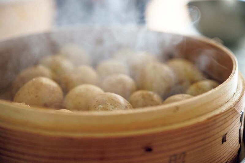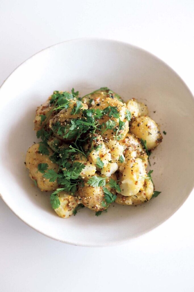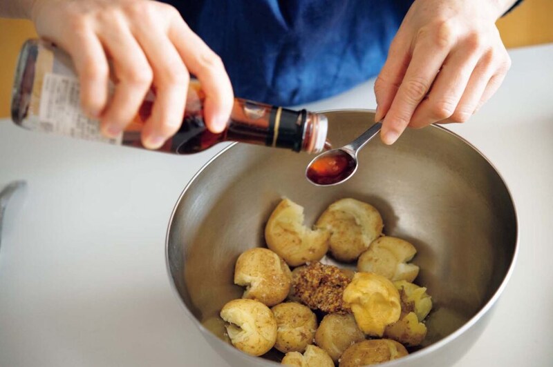 1.小ジャガイモは洗い、皮付きのまま、蒸気の上がった蒸し器で20分ほど軟らかめに蒸す。ボウルに入れて木ベラやスプーンの背で軽く押して割れ目を作っておく。