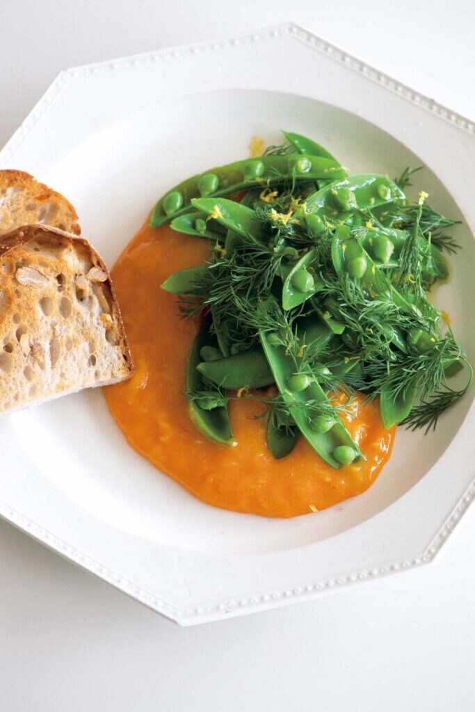 3.皿に2を盛り、スナップエンドウをのせる。スナップエンドウの上にオリーブオイルをかけ、レモンの皮とディルを散らす。